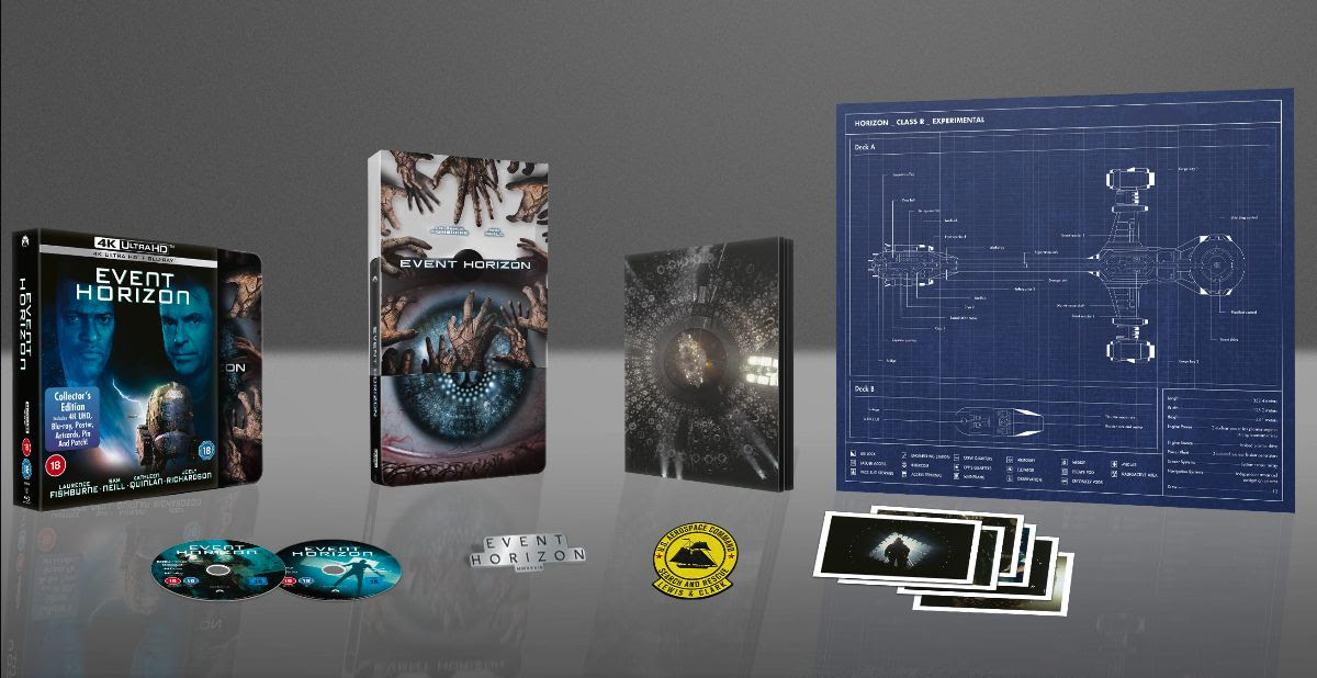 Infinite space delivers infinite terror in the horror cult classic EVENT HORIZON, celebrating its 25th anniversary with a new, 4K Ultra HD™ + Blu-ray™ Collector’s Edition SteelBook® on August 8, 2022 from Paramount Home Entertainment. This release includes an outer slipcase which houses the collectible SteelBook® in an acetate o-ring, a blueprint poster. art cards, pin and patch along with the film on 4K UHD™ and on Blu-ray™.