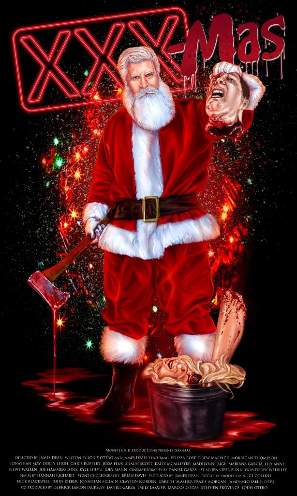 Elsewhere porno bigwig Johnny Duckett (Chris Ruppert) is assembling cast members for his latest shoot, an ambitious full feature Christmas porno horror. His stars Kristy Kreme (Morrigan Thompson), Black Mamba (Jonathan May), Jack Rabbit (Shaun Scott) and Angel Luv (Kaity Navi McAllister) are either cynical about Duckett’s ambitions, or see it as just another job, but they’re all incensed to learn that the producer is none other than accused sexual abuser Atilla the Hung (Kyle Shute) with his new lady Lana Luscious (the ubiquitous Felissa Rose).
