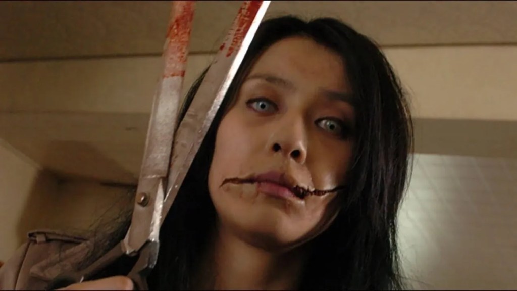 The plot of Carved The Slit Mouth Woman tells the story of a suburban Japanese town whose peaceful, almost picturesque, existence is rocked by the emergence of a supernatural serial killer. Known only as the Slit Mouth Woman, she, after luring the town’s people (with her victims largely being children) kills them the in the most gruesome and genuinely disturbing ways possible. It’s up to Yamashita (Eriko Sato) a divorced school teacher and her co-worker Matsuzaki (Haruhiko Kato) to put a stop to this malevolent force before it’s too late.